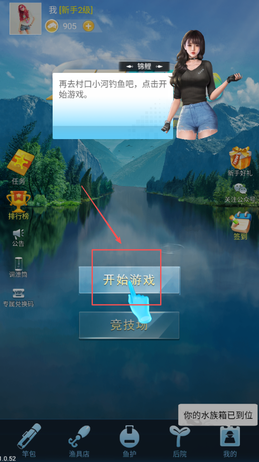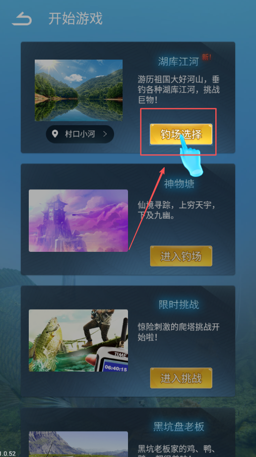 1、打开天天钓鱼官方版游戏,等待加载完成后进入主界面,在主界面找到开始钓鱼选项,点击后选择想要前往的钓场。
