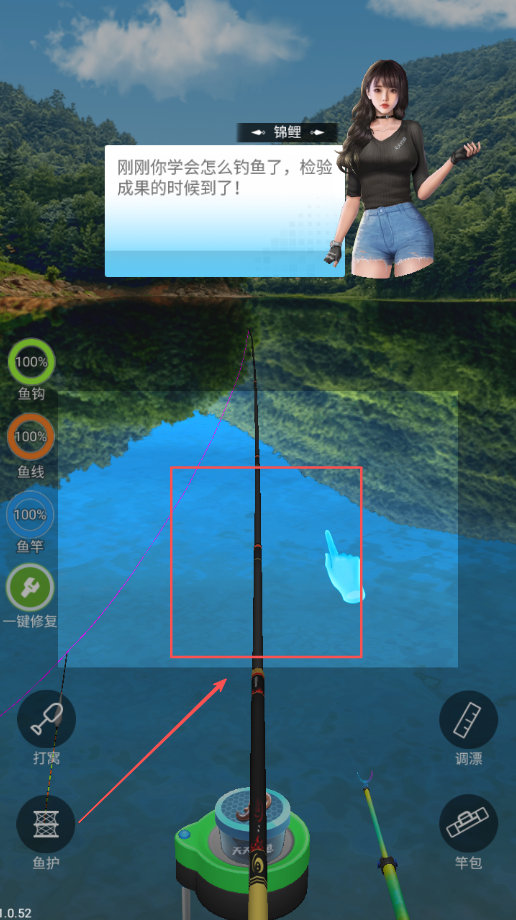 2、进入钓场后,先从背包里选择合适的鱼竿和鱼饵,根据当前钓场的鱼类特点,搭配能提高上钩率的装备组合。