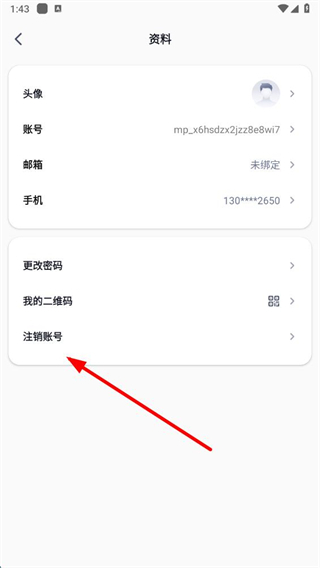 3、在资料页面点击注销账号选项,进入注销账号页面。