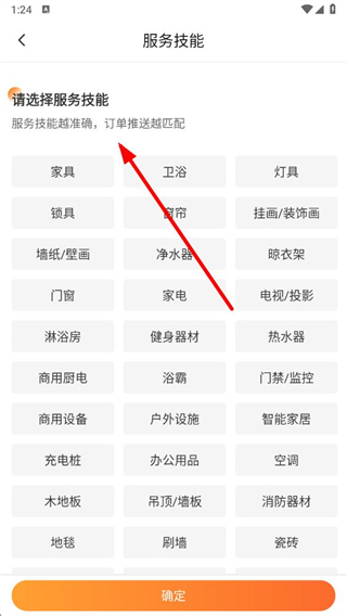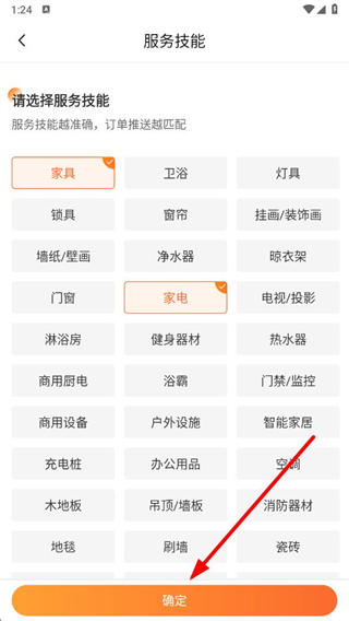 3、在服务技能选择页面选择对应的安装类别,如家具、家电等。
