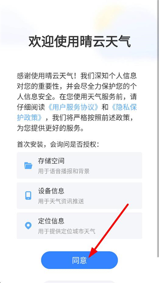 1、在欢迎使用晴云天气弹窗中,点击同意,进入添加城市页面。