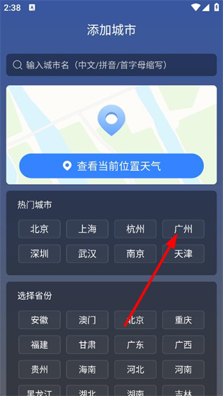 2、在添加城市页面,选择想要查看天气的城市,进入该城市天气页面。