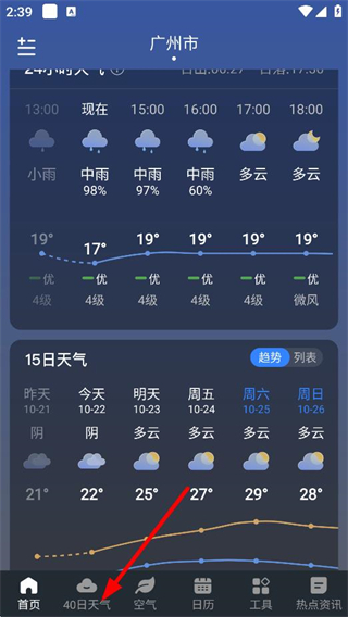3、在城市天气页面,点击底部40日天气,进入40日天气详情页面。