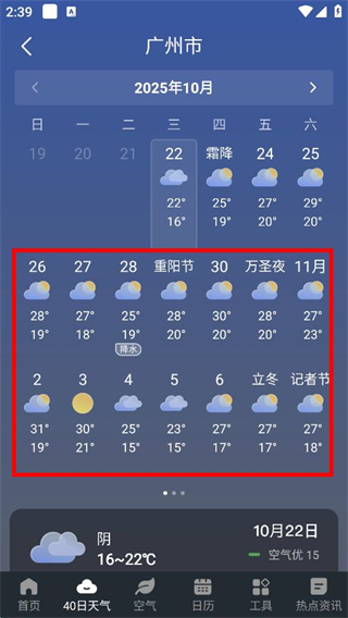4、在40日天气详情页面,可查看该城市未来40天的天气情况,如温度、天气状况等。