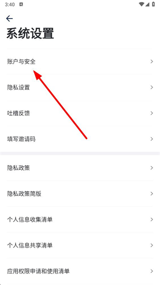 3、在系统设置界面点击账户与安全选项,进入账户与安全页面。