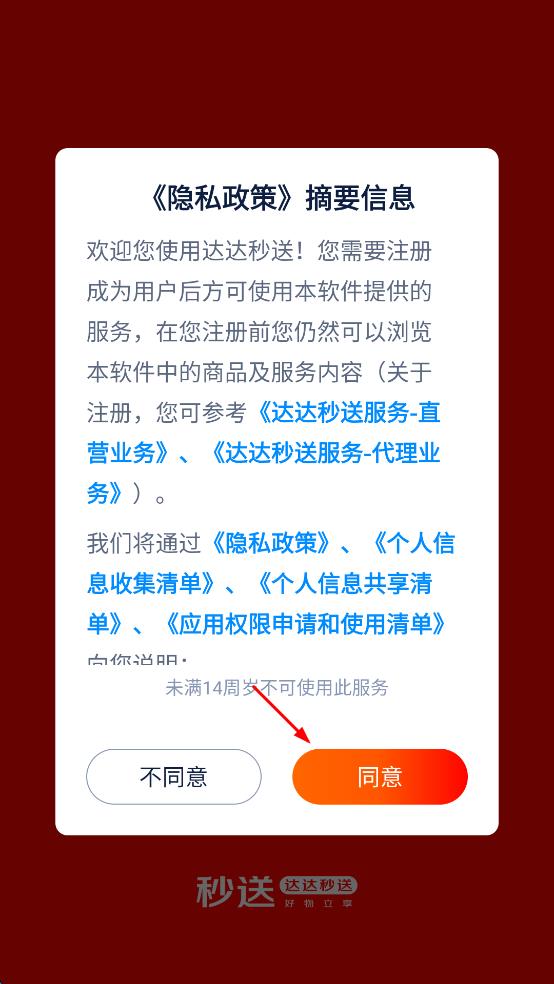 1、打开达达秒送软件,弹出隐私政策摘要信息提示框,仔细阅读后,点击“同意”按钮,进入软件主界面。