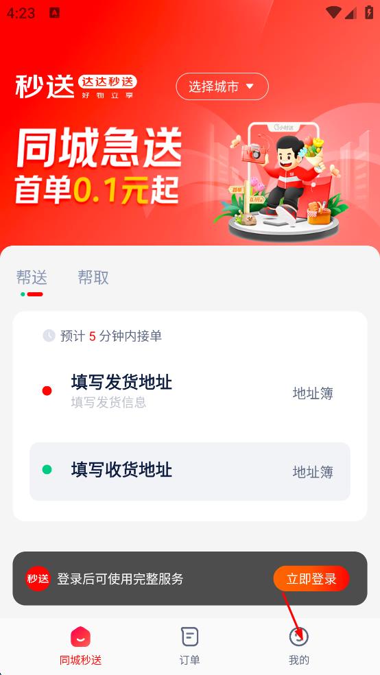 2、在达达秒送主界面,点击底部“我的”选项,进入登录相关页面。