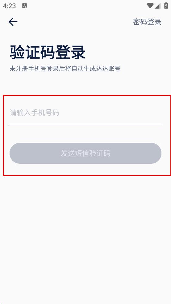 4、在验证码登录界面,在“请输入手机号码”输入框中输入手机号码,然后点击“发送短信验证码”按钮,待收到验证码后输入,完成登录操作。