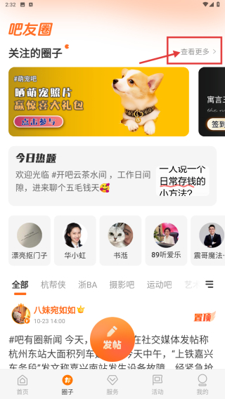 2、在吧友圈页面,点击查看更多选项,进入圈子广场页面。