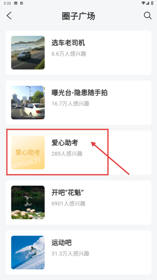 3、在圈子广场里,找到爱心助考圈子条目,点击进入圈子详情页。