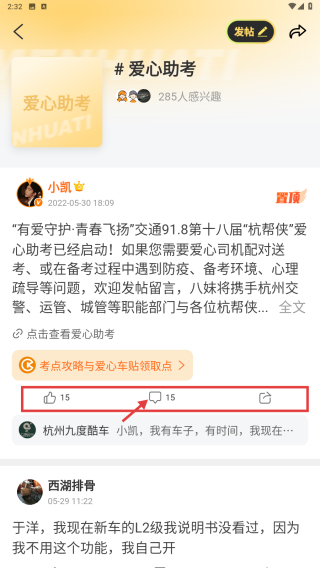 4、在圈子详情页,可参与帖子的评论互动,如对爱心助考相关内容进行讨论。