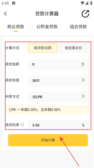 2、选择计算方式,输入商贷金额,选择商贷年限和利率方式后点击开始计算。