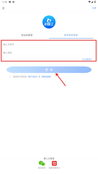 4、在账号密码登录页面,输入手机号码和密码后点击登录按钮,完成账号登录操作。