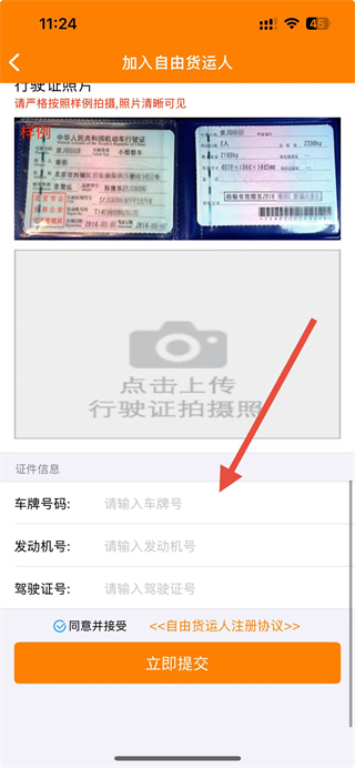4、在申请页面填写车牌号码、发动机号、驾驶证号等信息,上传行驶证照片,点击立即提交按钮。