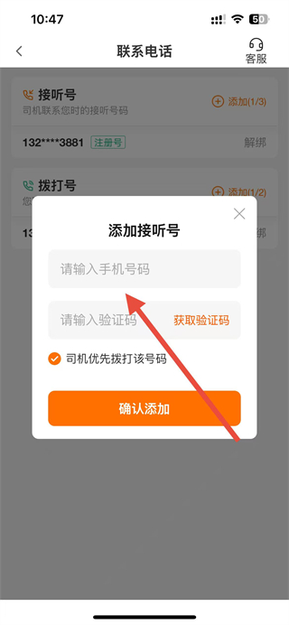 3、在联系电话页面点击添加按钮,弹出添加接听号或拨打号的输入框。