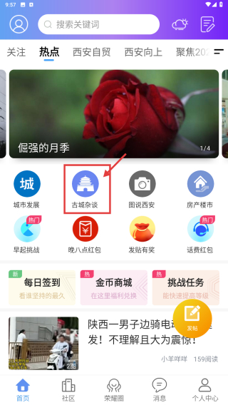 1、打开本地资讯应用,在首页点击古城杂谈分类,进入古城杂谈内容页面。