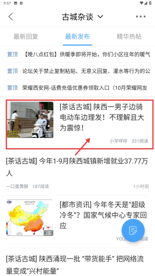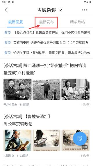 2、在古城杂谈内容页面,点击最新发布标签,浏览最新发布的资讯列表。