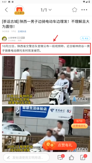 3、在资讯列表里,找到茶话古城陕西一男子边骑电动车边理发!不理解且大为震惊!资讯条目,点击进入资讯详情页。