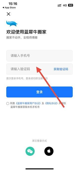 3、在登录注册页面输入手机号码和验证码。