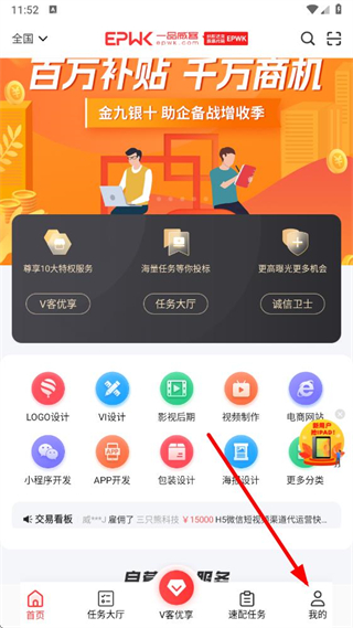 1、在一品接单app界面点击我的选项,进入个人页面。