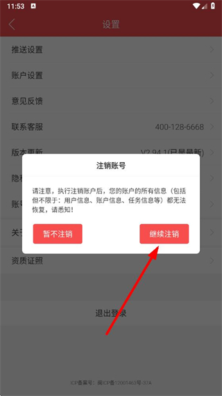 4、在注销账号确认框中点击继续注销按钮,按提示完成账号注销流程。