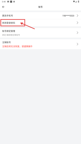 4、在账号管理页面,点击修改登录密码选项,进入密码修改页面完成密码修改操作。