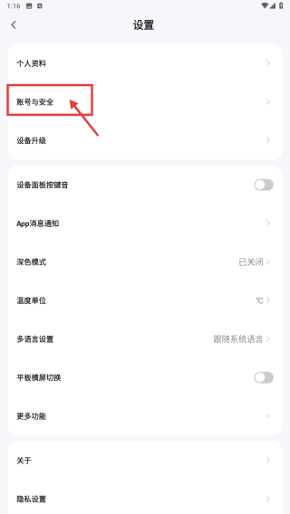 3、在设置页面,点击账号与安全选项,进入账号安全页面。