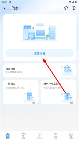 1、在海尔智家app智家页面点击添加设备选项,进入添加设备页面。