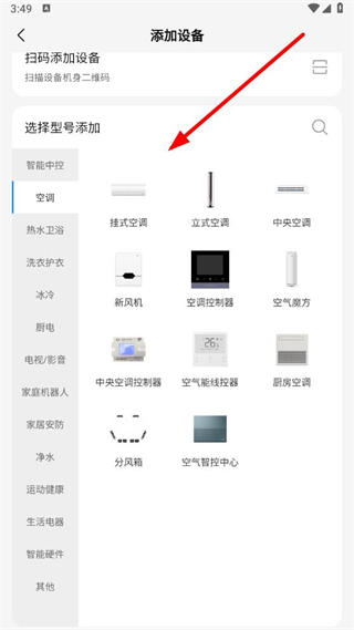 2、在添加设备页面选择需要添加的设备,进入扫码添加设备页面。
