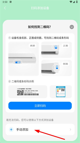 3、在扫码添加设备页面点击手动添加选项,进入手动添加设备流程。