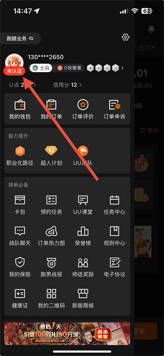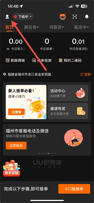 1、在UU跑腿跑男端首页点击左上角头像区域,进入个人功能页面。