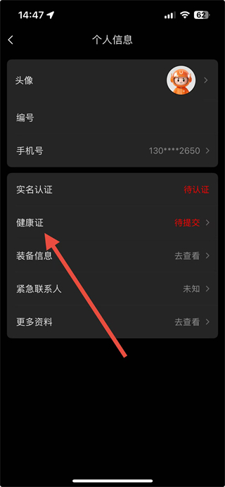 3、在个人信息页面点击健康证选项,进入健康证上传页面。