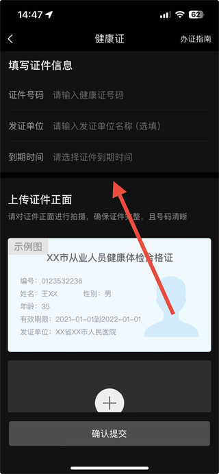 4、在健康证上传页面填写信息,上传健康证正面图片后点击确认提交按钮,完成健康证上传。