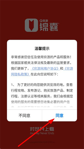1、在温馨提示的弹窗中,点击同意,进入APP首页。