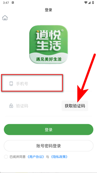 3、在登录界面,输入框中填写号码,点击获取验证码按钮。