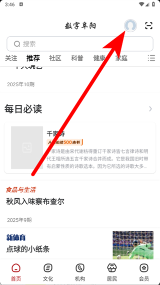 1、打开数字阜阳,点击页面右上角个人图标,进入个人中心页面。