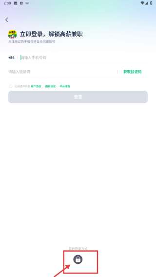 3、在登录方式选择界面,点击密码登录图标,进入密码登录页面。