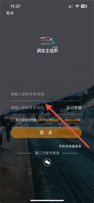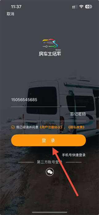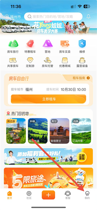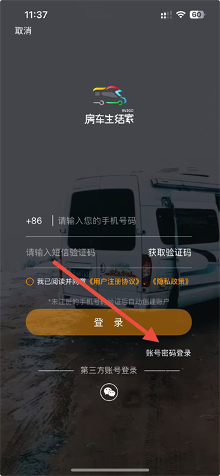 1、在房车生活家app首页点击我的选项,进入登录页面。