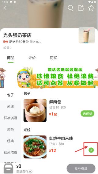 3、在店铺商品列表里,找到红烧牛肉米线商品,点击添加按钮将其加入购物车。