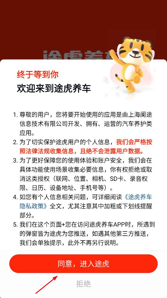 1、打开途虎养车软件,弹出“终于等到你欢迎来到途虎养车”的提示页面,阅读相关内容后,点击“同意,进入途虎”,进入软件主界面。