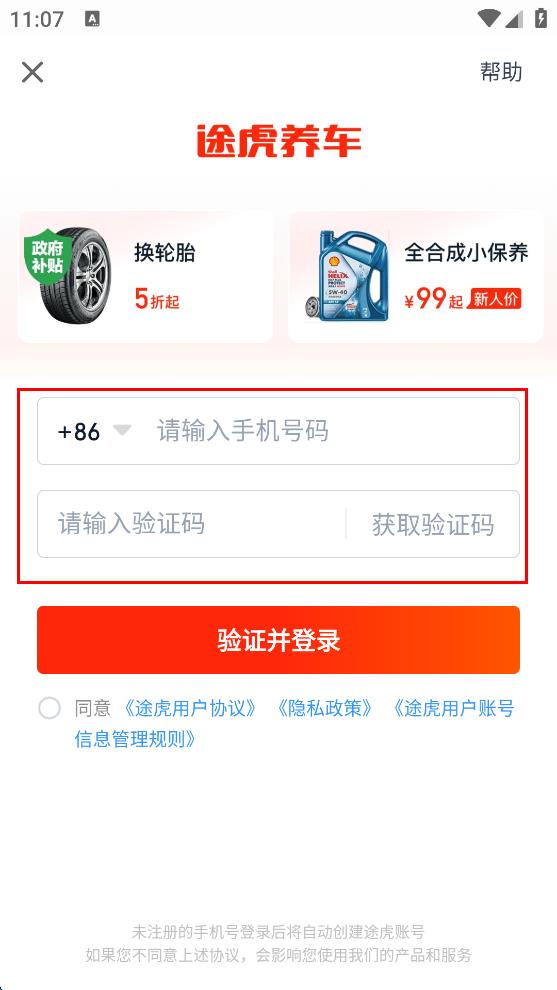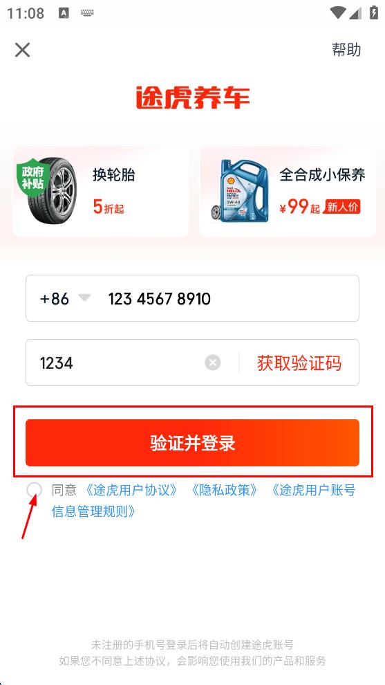 4、填写好手机号和验证码后,勾选同意途虎用户协议,隐私政策,途虎用户账号信息管理规则,最后点击“验证并登录”按钮,完成登录操作。
