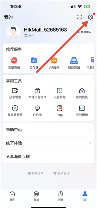 1、在海康互联app我的页面点击右上角设置图标,进入设置页面。