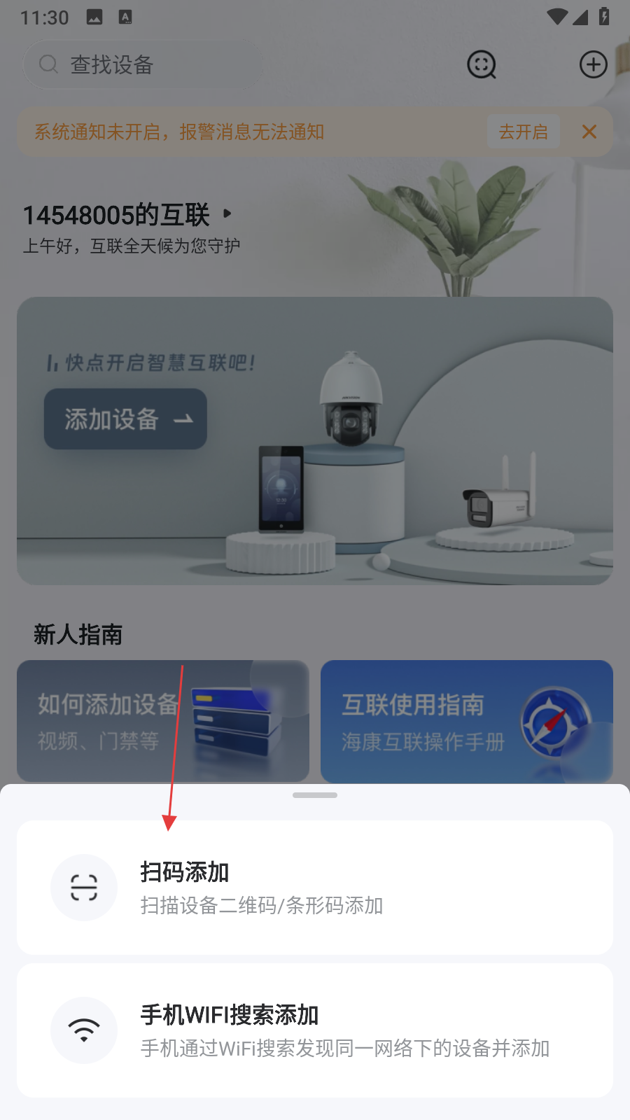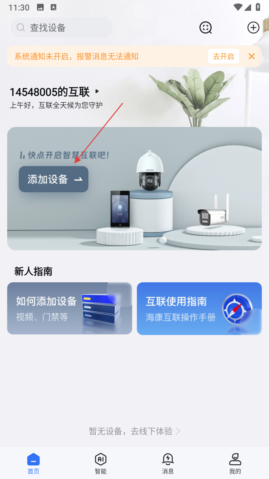 1、打开海康互联APP,在首页点击添加设备按钮。