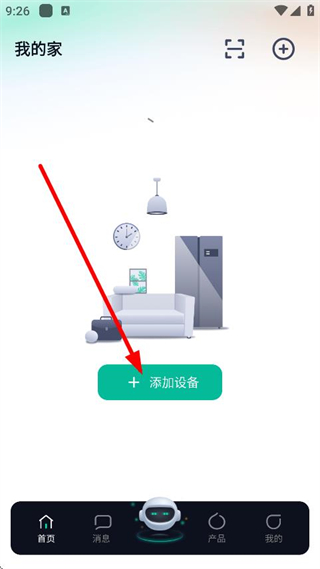 1、在我的家页面,点击添加设备,进入添加设备页面。
