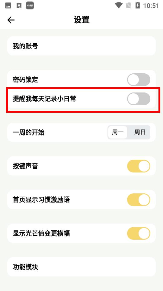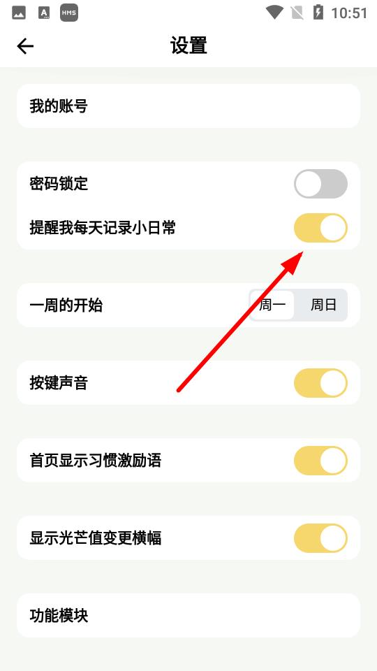 4、点击提醒我每天记录小日常,选项右侧的开关按钮将其开启,即可完成打卡提醒设置。