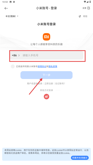 4、在小米账号登录页面,输入手机号后点击下一步,完成小米账号登录操作。