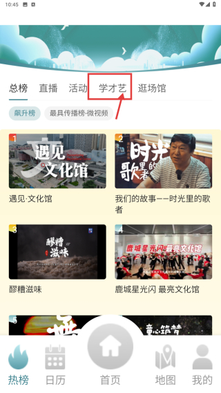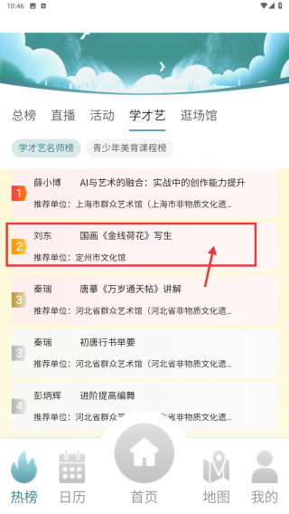 2、在热榜页面,点击学才艺分类选项,浏览学才艺课程列表。