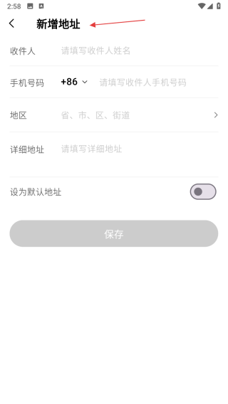 4、在新增地址页面,依次填写收件人、手机号码、地区、详细地址等信息,最后点击保存。