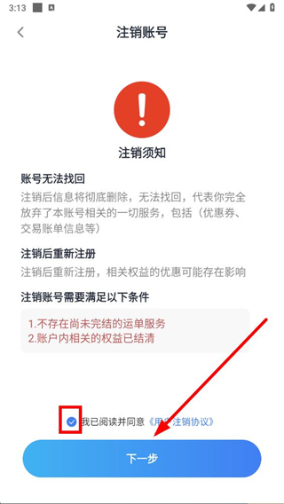 4、在注销账号页面勾选同意相关协议后点击下一步按钮,按提示完成账号注销操作。