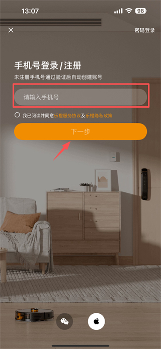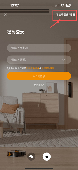 3、在登录界面,点击手机号登录/注册选项,进入手机号登录页面。
